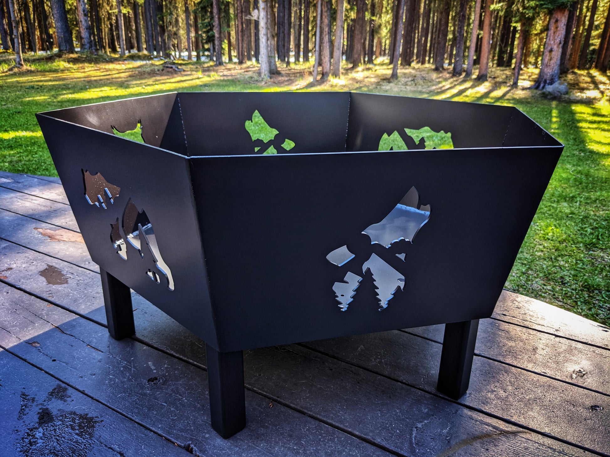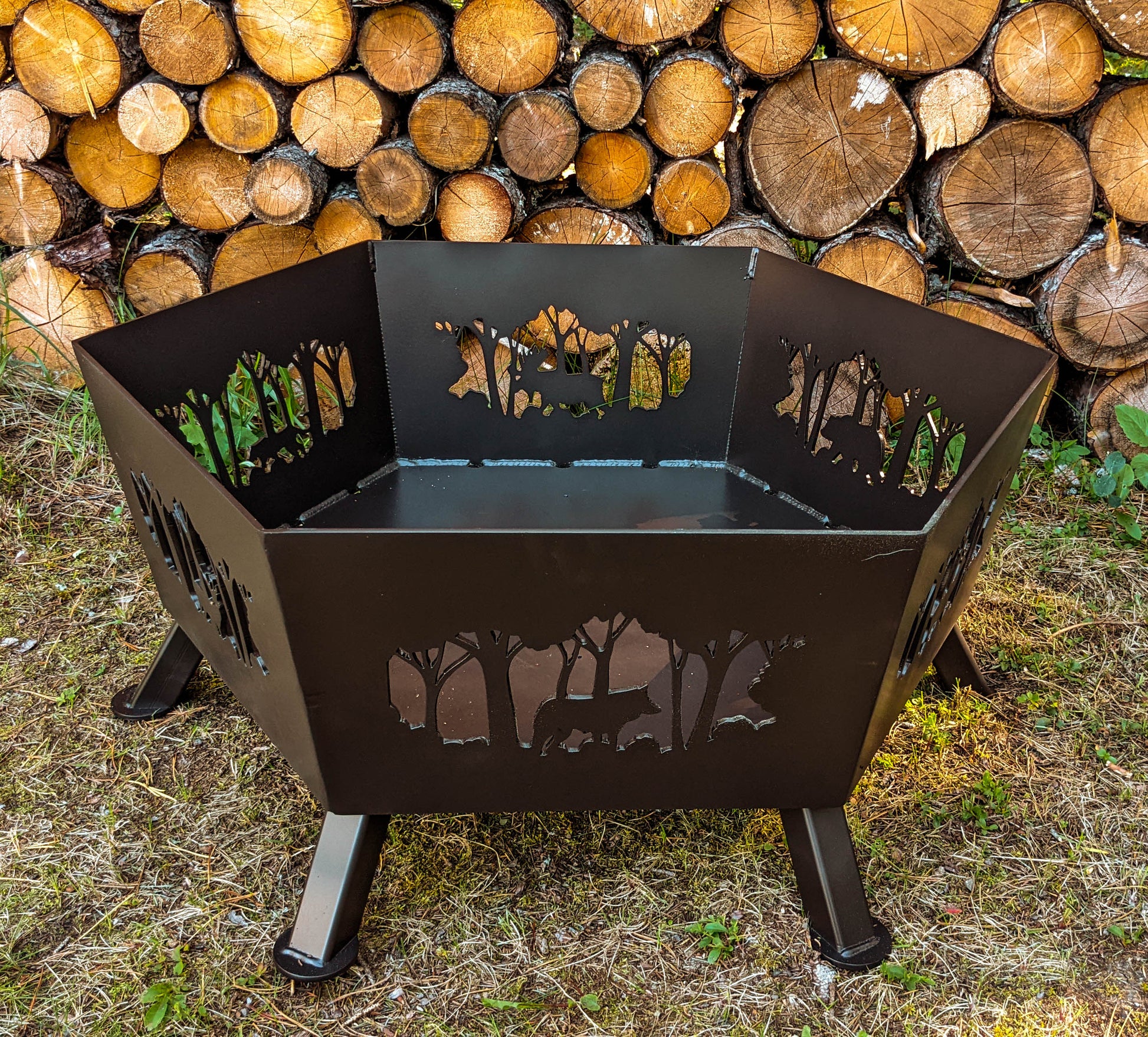 Our base model standard firepit: a fusion of functionality and artistry. Designed in a distinctive hexagon shape, this firepit brings together both form and function. Each side boasts precision cutouts, allowing you to choose up to three unique designs that will be featured twice, casting mesmerizing shadows as the fire dances within.